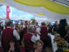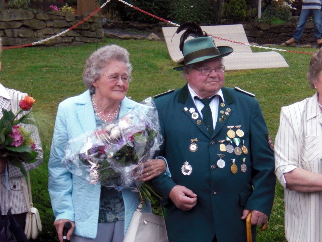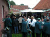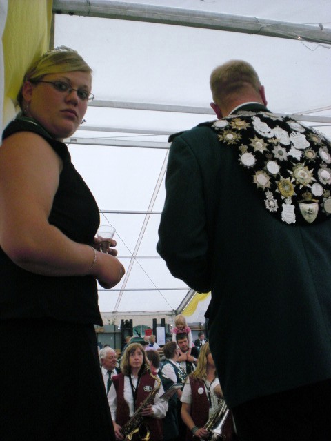 Nachdem sich die Vereinsmitglieder und Gäste bei eher durchwachsenem Wetter gestärkt hatten, ging es wieder mit dem Bus zurück ins Dorf. Am Ehrenmal an der evangelischen Kirche gedachten die Mitglieder ihrer verstorbenen Kameraden, aber auch all derer, die durch Terror und Gewalt ihr Leben geben mussten. Der 1. Vorsitzende Hans-Jürgen Hukriede erinnerte in seiner Rede auch an das 60-jährige Bestehen der Bundesrepublik Deutschland sowie an den Fall der Mauer vor 20 Jahren. Am Festplatz angekommen, war die Cafeteria bereits in vollem Gange. Weiterhin bestand die Möglichkeit, beim vom Schützenverein Hagen-Mentrup betreuten Armbrustschießen, die mit 30 Liter Bier dotierte "Bierkönigs"-Würde zu erringen. Hierbei konnte sich Kathrin Birkemeier durchsetzen, sie ist damit neuer Lienener Bierkönig. Ein besonderes Jubiläum feierte in diesem Jahr Erna Peters, die vor 50 Jahren an der Seite von Gottfried Peters (†) Königin des Schützenvereins Lienen-Aldrup war. Der Aldruper Verein ging später im Schützenverein Lienen auf. Das silberne Königsjubiläum (25 Jahre) begingen Waltraud Beek und Willi Peters. Auf 25jährige Mitgliedschaft konnten folgende Schützen zurückblicken: Friedrich-Wilhelm Königkrämer (Vater des amtierenden Königs) und Werner Saatjohann.